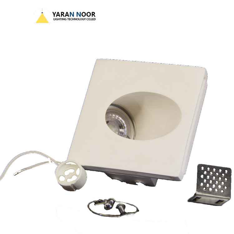 قاب هالوژن توکار از جنس گچ فشرده با طراحی ظریف و مینیمال، مناسب برای نورپردازیهای مدرن و مخفی.