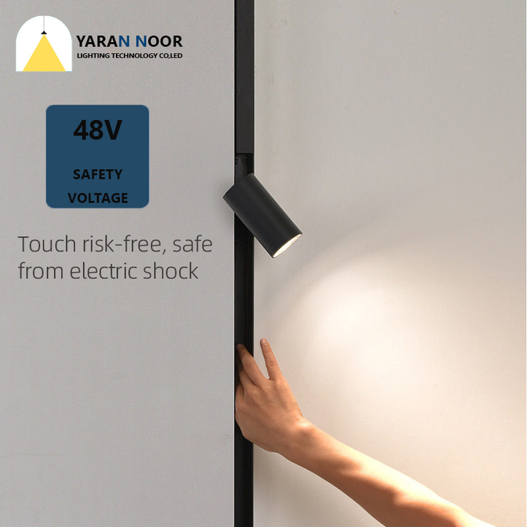 یک چراغ فلودلایت با طراحی قوسی است که بر روی ریل مغناطیسی نصب میشود. این نوع چراغها به دلیل طراحی خاص و نور متمرکز، برای فضاهایی که نیاز به نورپردازی دقیق دارند، مناسب هستند.